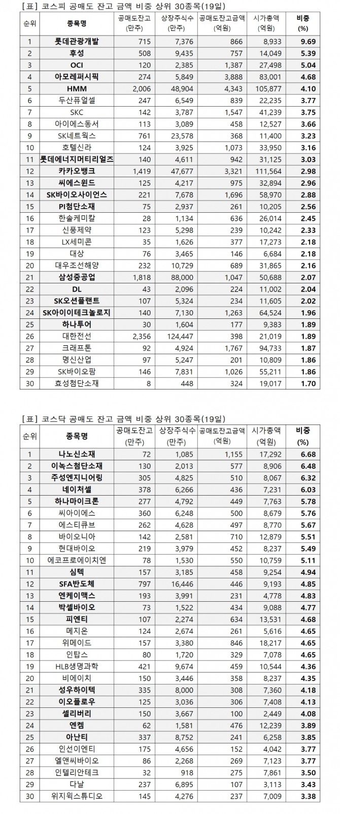 24일 한국거래소에 따르면 지난 19일 기준 유가증권시장과 코스닥시장에서 시가총액 대비 공매도 잔고금액 비중 상위 종목은 다음과 같다.