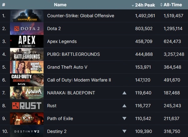 스팀 운영사 밸브 코퍼레이션의 '카운터 스트라이크: 글로벌 오펜시브'와 '도타 2', EA '에이펙스 레전드', 크래프톤 '펍지: 배틀그라운드', 락스타 게임즈 '그랜드 테프트 오토(GTA) 5', 액티비전 '콜 오브 듀티: 모던 워페어 2' 리마스터판 등 톱6 게임은 꾸준히 제 자리를 지켰다.