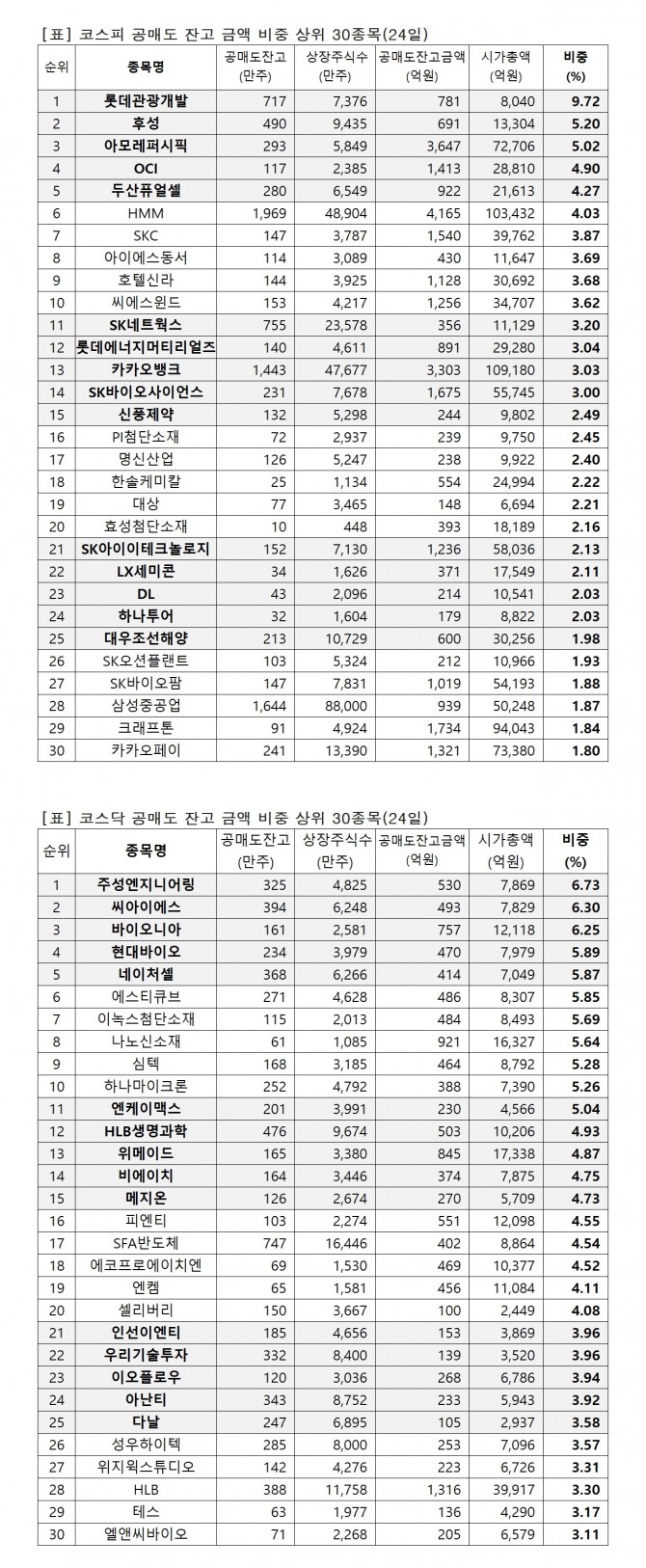 이미지 확대보기유가증권시장 시가총액 대비 공매도 잔고금액 비중(24일)