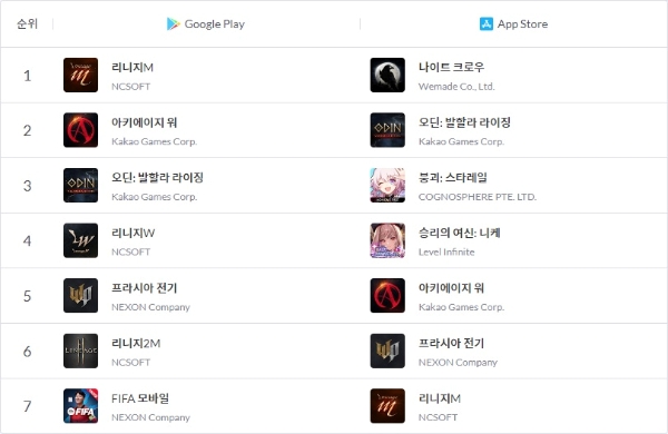 아키에이지 워는 지난달 21일 오전 11시 출시 후 약 5시간 만인 오후 3시 40분 경 애플 매출 1위를 달성했다. 프라시아 전기의 경우 나이트 크로우와 같이 자정에 출시, 오후 6시 50분에 매출 1위를 차지했다. 즉 나이트 크로우는 프라시아 전기보단 빠르나 아키에이지 워보단 느린 템포로 성과를 거두고 있다.