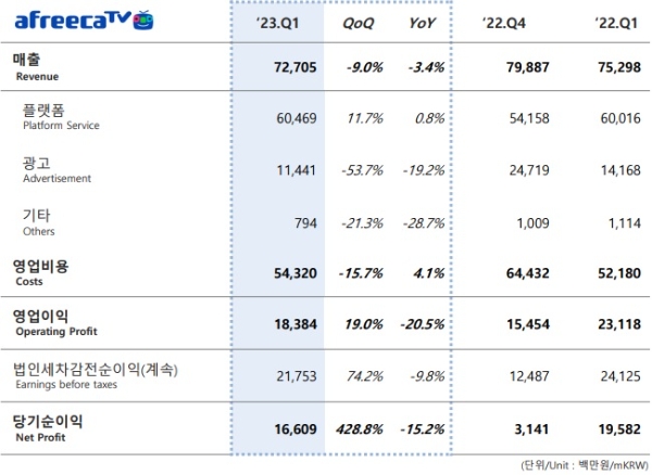 아프리카TV의 2023년 1분기 실적 발표 자료. 사진=아프리카TV