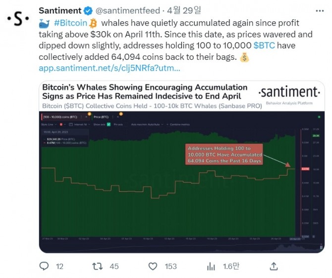 산티먼트는 "비트코인 고래들은 4월 11일 3만 달러 이상의 차익 실현 이후 조용히 다시 매집에 나섰다. 이날 이후 가격이 소폭 하락하면서 100~1만 BTC를 보유한 주소는 총 6만4094개의 코인을 다시 가방에 추가했다"고 전했다.