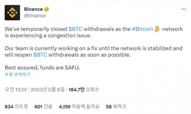 세계 최대 암호화폐 거래소 바이낸스가 7일(현지시간) 네트워크 정체 문제로 비트코인 인출을 일시 중단한 뒤 ​​출금을 재개했다. 출처=바이낸스 트위터