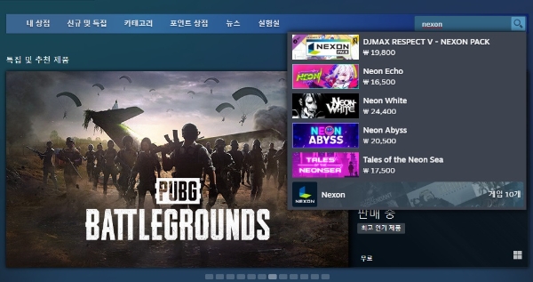 스팀 메인 화면 검색 창에 국내 게임사 넥슨을 검색해봤다. 사진=이원용 기자이미지 확대보기