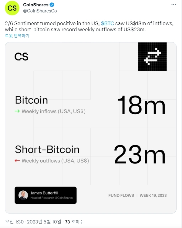 제임스 버터필 코인셰어즈 리서치 책임자는 암호화폐 업계 전반의 거래량은 2023년 초의 절반 수준이지만, 투자 상품에 대한 관심은 작년 이맘때보다 16% 증가하는 추세라고 밝혔다.