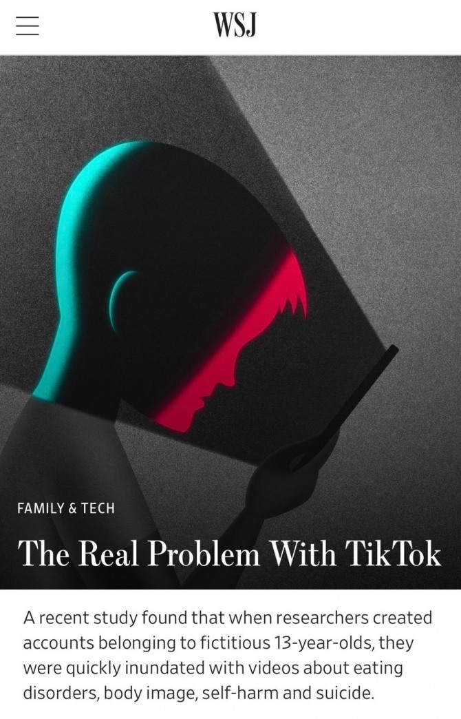 WSJ는 ‘틱톡이 진짜 문제’라는 제목의 기사에서 “틱톡 이용자의 정보가 엉뚱한 손에 들어갈 수 있다는 이유로 미국 정부가 틱톡의 미국 내 서비스 금지를 추진하고 나서는 등 미국 내에서 틱톡을 규제해야 한다는 목소리가 커지고 있다”면서 “그러나 전문가들의 최근 연구 결과 자식을 기르는 부모의 입장에서 보면 틱톡의 추천 알고리즘 문제가 더 심각한 것으로 확인됐다”고 전했다.