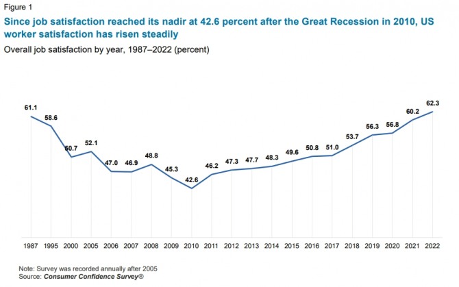 컨퍼런스보드에 따르면 올해 설문조사에 참여한 근로자의 62.3%가 자신이 하는 일에 대해 만족한다고 답해 지난해와 비교해 2%포인트 증가했다. 보고서는 “이는 미국 경제가 글로벌 금융위기 여파로 지난 2010년 공황 국면에 들어섰을 때 조사된 42.6%와 비교하면 특히 커다란 격차”라고 밝혔다.