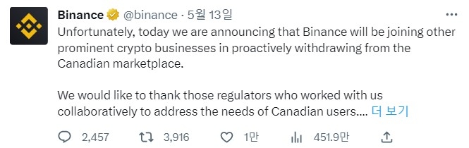 바이낸스는 지난 12일 트윗을 통해 "캐나다의 나머지 블록체인 산업에 큰 기대를 걸었다"면서도 "안타깝게도 암호화폐 거래소에 제공되는 스테이블 코인 및 투자자 한도와 관련된 새로운 지침으로 인해 현재 캐나다 시장은 바이낸스가 더 이상 버틸 수 없게 되었다"고 밝혔다.
