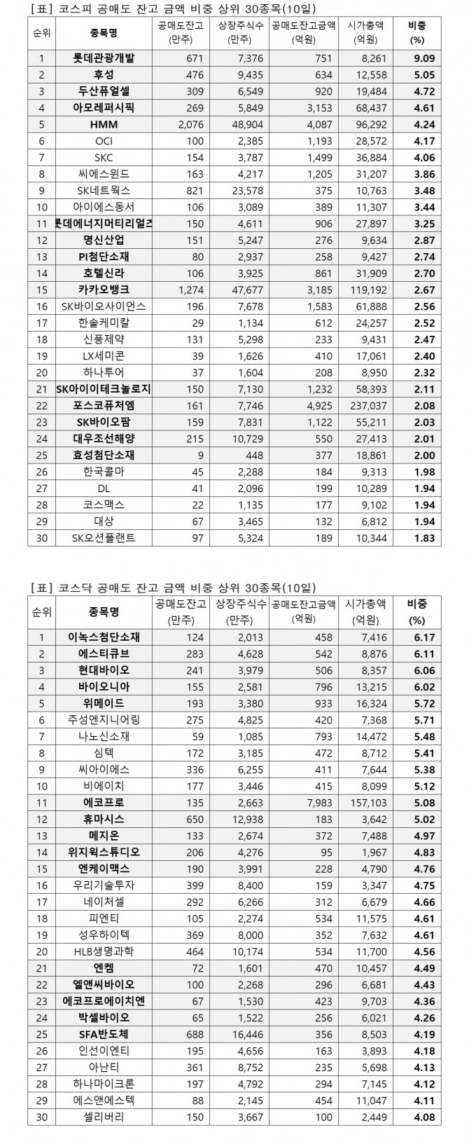 이미지 확대보기15일 한국거래소에 따르면 지난 10일 기준 유가증권시장과 코스닥시장에서 시가총액 대비 공매도 잔고금액 비중 상위 종목은 다음과 같다.