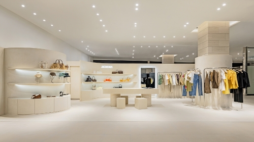 자크뮈스의 새 매장은 신세계백화점 센텀시티점 2층에 위치하고 60.42㎡(약 18.3평) 규모다. 이번 매장은 벽면을 따라 흐르는 듯한 유려한 곡선과 기둥이 주요 디자인 요소로 활용됐다. 바닥에서 벽을 타고 가구 하부장으로 이어지는 독특한 곡선 디테일이 마치 매장 전체가 하나로 이어지는 것처럼 통일된 느낌을 주며 질감이 살아있는 밝은 크림 톤의 페인트 소재로 매장이 완성됐다.