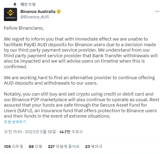 바이낸스 호주는 18일 트위터를 통해 "'제3자 결제 서비스 제공업체의 결정으로 인해' 호주 달러 페이아이디 입금이 중단되었으며 은행 송금 인출도 영향을 받게 될 것"이라고 밝혔다.