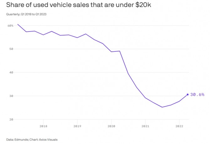 18일(이하 현지시간) 악시오스에 따르면 자동차시장 조사업체 에드먼즈닷컴이 최근 집계한 결과 2만달러 이하 가격의 중고차 매물이 미국 중고차 시장에서 눈에 띄게 줄어든 것으로 나타났다.