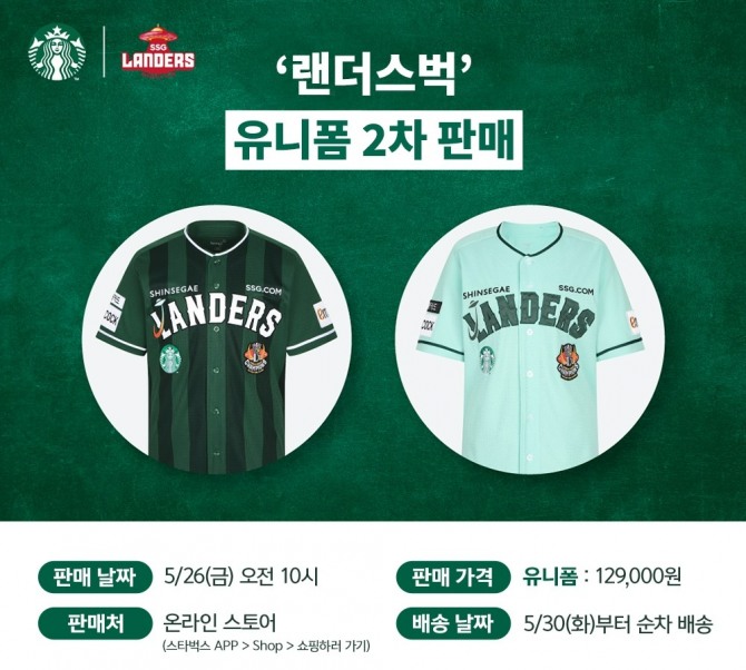 스타벅스는 오는 26일 오전 10시부터 스타벅스 앱 내 온라인 스토어를 통해 ‘랜더스벅 유니폼’을 2차 판매한다. 2차 출시로 준비된 ‘랜더스벅 유니폼’ 수량은 그린 1500장, 민트 500장으로 지난 1차 판매 수량보다 1000장 증가한 총 2000장을 선보인다.