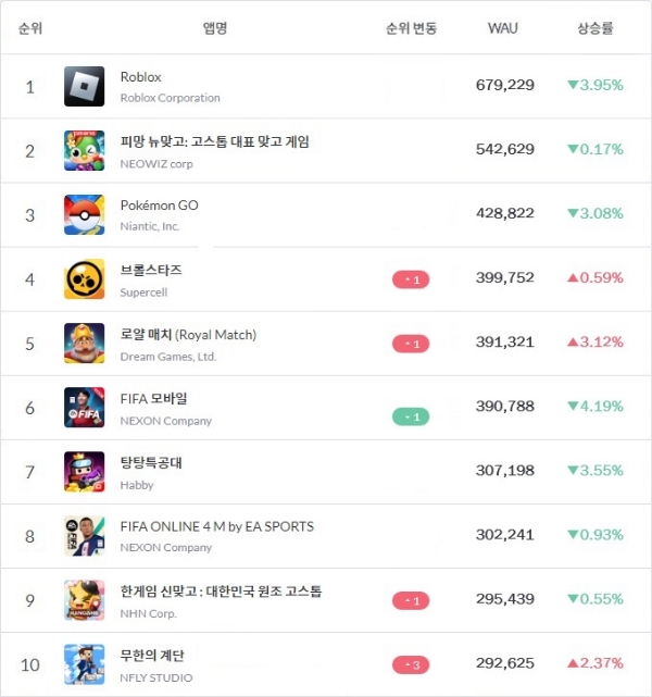 구글 플레이스토어 5월 3주차 WAU 톱10 게임 중 가장 높은 수익을 거둔 것은 넥슨 '피파 모바일'이었다. 그 외 '로블록스'가 매출 12위, '피파 온라인 4M'이 20위, 로얄 매치가 23위, '탕탕특공대'가 29위에 올랐다.