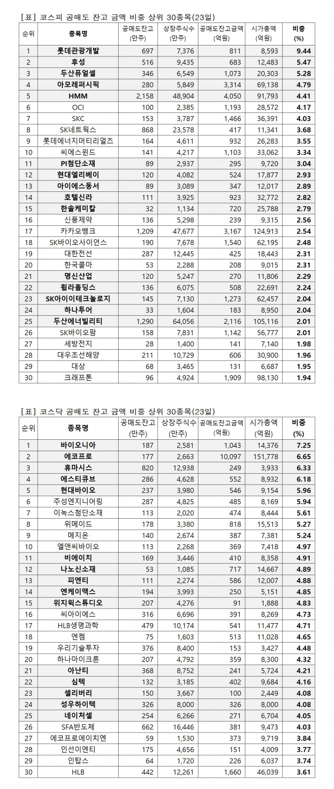 이미지 확대보기유가증권시장 시가총액 대비 공매도 잔고금액 비중(23일)