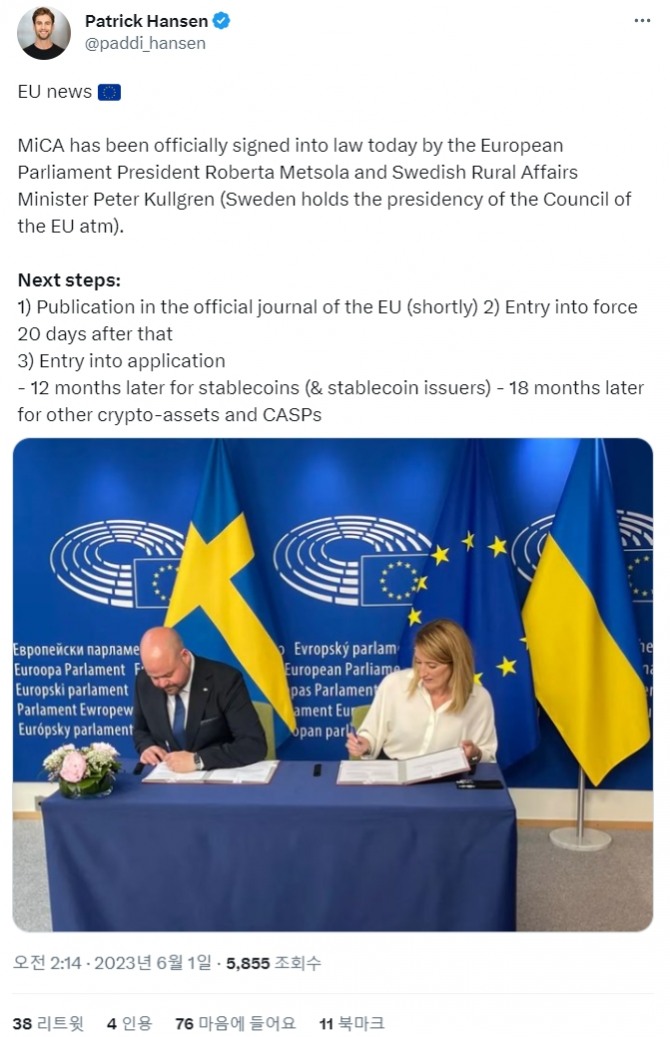 이미지 확대보기피터 쿨그렌 스웨덴 농촌부 장관과 로베르타 메솔라 유럽의회 의장은 5월 31일 유럽위원회가 법안을 발표한 지 약 3년 만에 오랫동안 기다려온 암호화폐 규제 프레임워크에 법으로 서명했다.