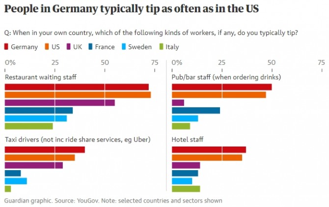 결론적으로 팁이 일상화된 것으로 유명한 미국 외에 유로존에서 팁 문화가 가장 발달한 곳은 유로존 최대 경제강국인 독일인 것으로 나타났다. 거의 미국과 비슷한 수준인 것으로 확인됐다.