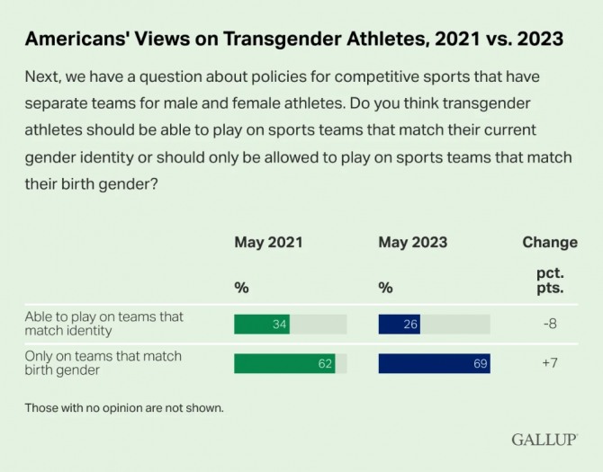미국민의 69%가 생물학적 성에 맞지 않게 선수들을 체육 대회에 출전시키는 것을 반대한다는 뜻이다.