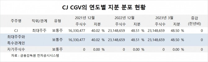CJ의 지분분포는 올해 3월말 기준으로 최대주주인 CJ가 지분 48.50%(2314만8659주)를 갖고 있습니다. CJ는 CJ CGV의 유상증자에서 현물출자가 없다면 납입할 증자대금이 약 2488억원 규모에 달하는 것으로 추정됩니다.
