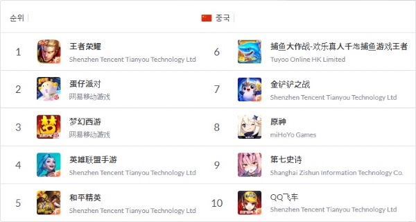 같은 시기 8위를 기록한 것은 국내에서도 큰 인기를 끌고 있는 호요버스의 '원신', 7위는 라이엇 게임즈의 '전략적 팀 전투(TFT)'의 중국 모바일 버전 '금산산지전(金铲铲之战)'으로 대형 히트작들과 대등한 반열에 오른 셈이다.