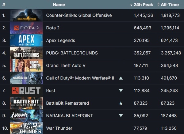 최상위권 게임들의 최다 동시 접속자 수와 전주 대비 변화율을 살펴보면 △밸브 코퍼레이션 '카운터 스트라이크 글로벌 오펜시브': 144만5136명(-5.6%) △밸브 '도타 2': 64만8493명(-0.1%) △EA '에이펙스 레전드': 37만195명(2.5%) △크래프톤 '펍지: 배틀그라운드': 35만2057명(-1.3%)였다.