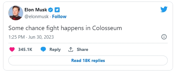 TMZ의 보도가 나온 직후 머스크 CEO도 트위터에 올린 글에서 “콜로세움에서 시합이 벌어질 수도 있겠다”고 밝혀 두 기업인 간 세기의 격투가 이곳에서 벌어질 가능성을 높였다.