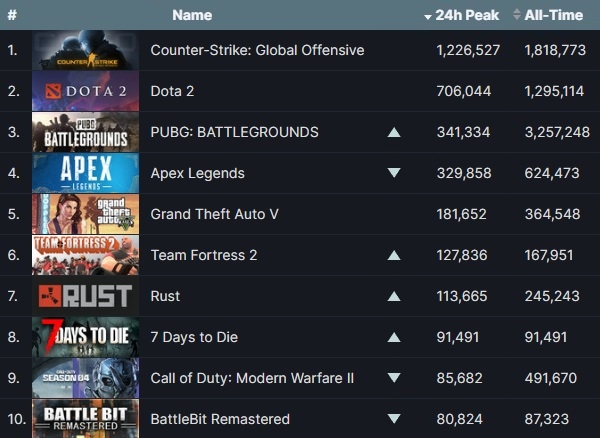 크래프톤 '펍지: 배틀그라운드'가 경쟁작인 일렉트로닉 아츠(EA) '에이펙스 레전드'를 상대로 순위 역전에 성공했다. 밸브 코퍼레이션의 출시 16년차 슈팅 게임 '팀 포트리스 2'는 90% 세일에 힘입어 동시 접속자 순위 6위까지 치고 올라왔다.