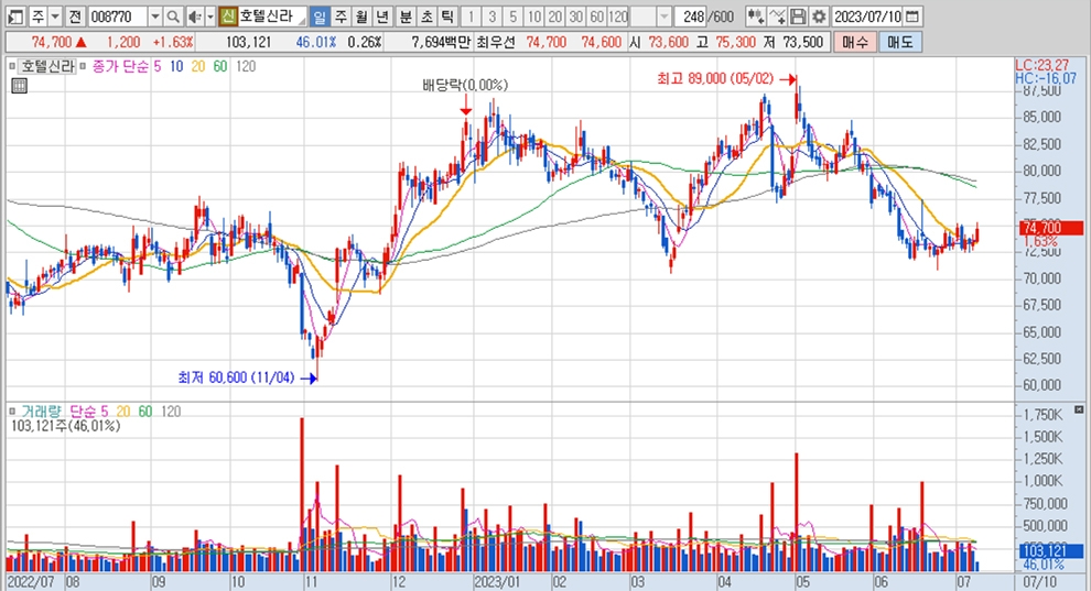 이미지 확대보기호텔신라의 주가는 10일 오전 9시 50분 현재 전일보다 1200원(1.63%) 오른 7만4700원에 거래되고 있습니다.