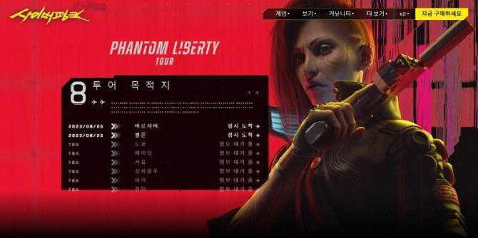 이미지 확대보기10일 공개된 CDPR의 한국 공식 SNS에는 8월 5일 폴란드 바르샤바, 8월 25일 독일 쾰른 방문 일정이 공개됐다. 아직 이후 도시의 상세 행사 일정은 공개되지 않았지만 한국이 포함돼 있어 한국 팬들의 기대감을 높였다.