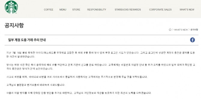 스타벅스 측은 “고객님의 불편함과 번거로움에 머리 숙여 사과드린다”며 “재발 방지를 위해 강화된 인증 방안을 추가로 마련하고, 고객 개인정보와 자산 보호를 위해 최선의 노력을 다하겠다”고 전했다.