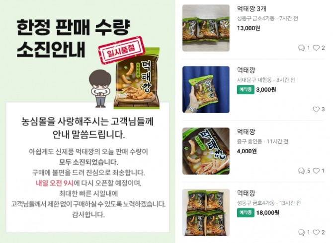농심몰 먹태깡 품절 안내 공지(왼쪽)과 중고거래앱에서 먹태깡에 웃돈을 주고 거래하는 모습(오른쪽). 사진=각사 화면 캡쳐.