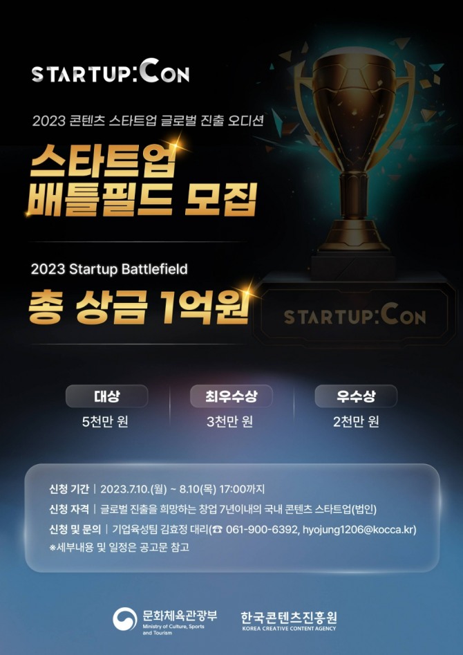 경쟁피칭 프로그램 ‘배틀필드’를 통해 국내 우수 콘텐츠 스타트업의 경쟁력 강화와 글로벌 진출을 지원한다. 창업 7년 이내의 콘텐츠 스타트업이라면 누구나 지원할 수 있으며 ▲1차 예선(20개 팀) ▲2차 본선(10개 팀)을 거쳐 ▲3차 결선을 통해 총 3개 팀을 선발한다. 3차 결선은 스타트업콘에서 현장 공개 피칭을 통해 이뤄지며, 사전에는 모의 크라우드 펀딩 형식으로 온라인 대국민 투표를 진행해 가산점을 부여한다.