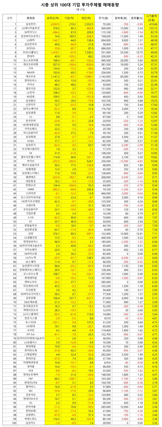 1위 LG에너지솔루션 -464억원(-8만주), 2위 유한양행 -438억원(-67만주), 3위 금양 -397억원(-33만주), 4위 삼성바이오로직스 -207억원(-3만주), 5위 NAVER -174억원(-9만주), 6위 씨에스윈드 -162억원(-20만주), 7위 포스코퓨처엠 -152억원(-3만주), 8위 메리츠금융지주 -127억원(-27만주), 9위 셀트리온 -124억원(-8만주), 10위 코스모신소재 -102억원(-5만주), 11위 KB금융 -102억원(-21만주), 12위 TCC스틸 -89억원(-15만주), 13위 카카오 -88억원(-17만주), 14위 삼성물산 -76억원(-7만주), 15위 KT -74억원(-25만주), 16위 LG전자 -73억원(-6만주), 17위 이수페타시스 -67억원(-18만주), 18위 삼성엔지니어링 -65억원(-19만주), 19위 한미약품 -59억원(-2만주), 20위 기아 -58억원(-7만주)