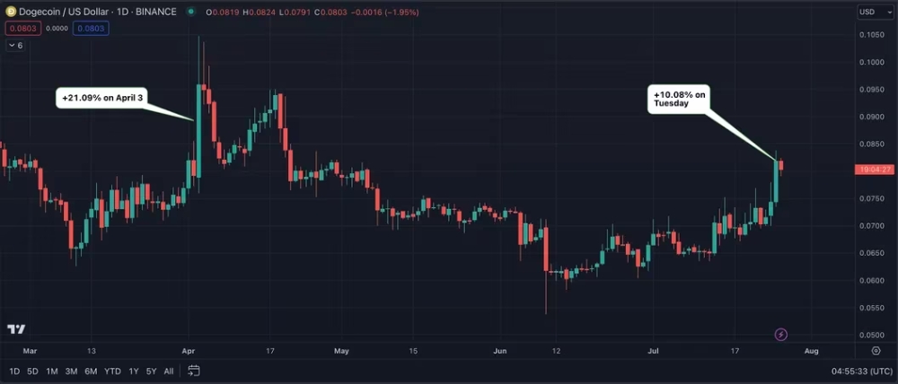 이미지 확대보기코인데스크는 차트 플랫폼 트레이딩뷰가 추적한 바이낸스 데이터를 인용해 도지코인이 25일(현지시간) 10% 상승하며 4월 3일 이후 가장 큰 하루 상승 폭을 기록했다고 보도했다.