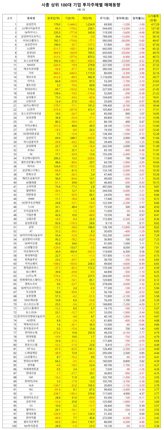 1위 삼성전자 -1444억원(-206만주), 2위 SK하이닉스 -772억원(-64만주), 3위 POSCO홀딩스 -711억원(-12만주), 4위 기아 -640억원(-79만주), 5위 현대차 -578억원(-30만주), 6위 삼성SDI -325억원(-5만주), 7위 LS ELECTRIC -298억원(-26만주), 8위 LG전자 -208억원(-19만주), 9위 포스코퓨처엠 -182억원(-4만주), 10위 LG에너지솔루션 -170억원(-3만주), 11위 카카오 -160억원(-30만주), 12위 현대모비스 -153억원(-7만주), 13위 LS -145억원(-12만주), 14위 삼성중공업 -110억원(-121만주), 15위 하이브 -107억원(-4만주), 16위 LG화학 -105억원(-2만주), 17위 카카오페이 -103억원(-20만주), 18위 HD현대건설기계 -101억원(-13만주), 19위 이수페타시스 -88억원(-24만주), 20위 삼성엔지니어링 -78억원(-21만주)