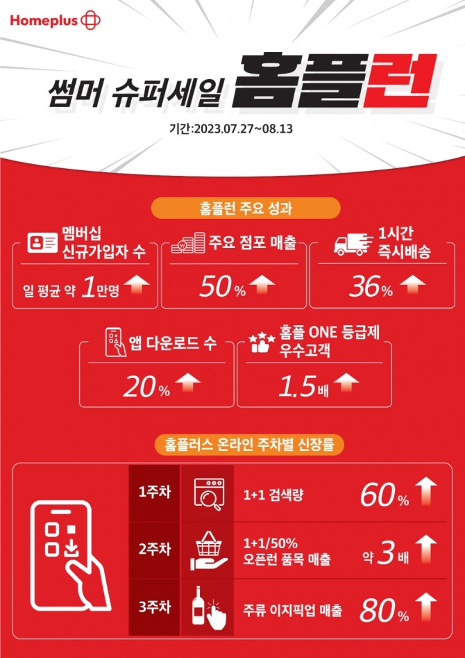 흥행 열기에 입소문을 타며 신규 고객도 증가했다. 행사기간 동안 ‘마이홈플러스’ 멤버십 신규 가입자는 일 평균 약 1만 명씩 늘었고, ‘홈플 ONE 등급제’ 우수고객 혜택을 받은 고객은 등급제 출시 첫 달(6월) 대비 1.5배 많아졌다. 행사 첫 주 홈플러스 온라인 앱 다운로드 수는 약 20% 늘었다.