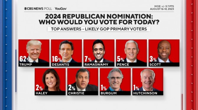 CBS뉴스 '공화당 대선주자 지지도' 조사 결과, 트럼프 62% vs 디샌티스 16%