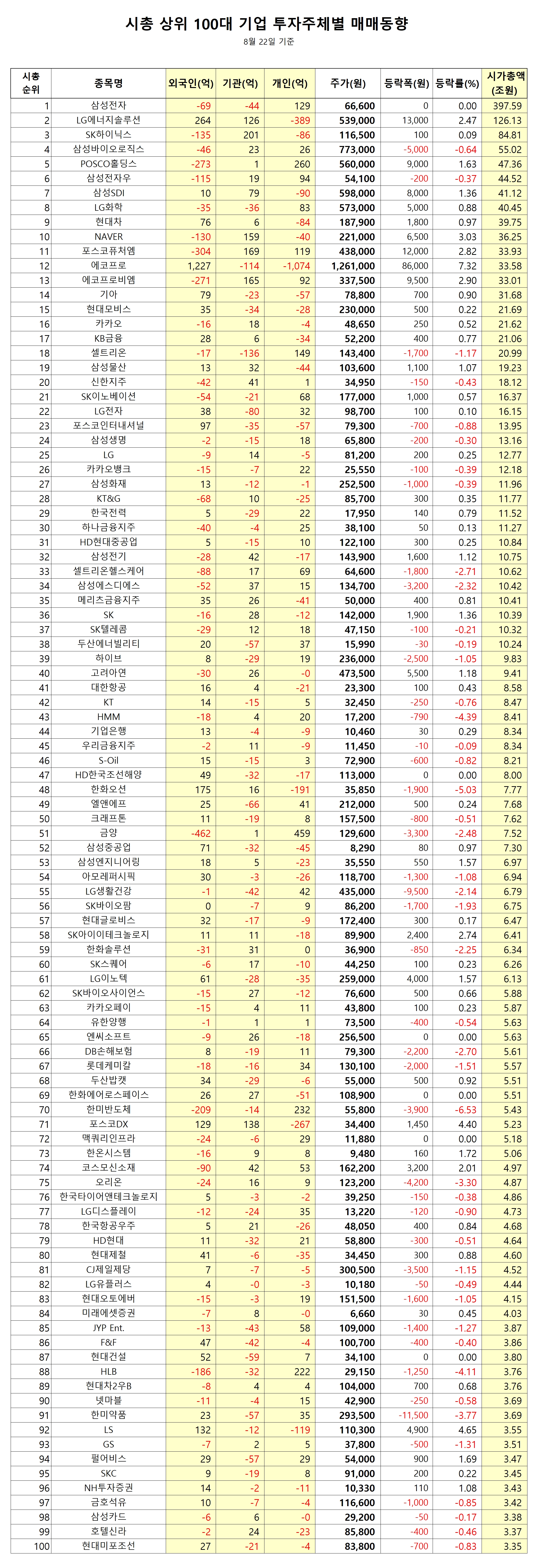1위 LG에너지솔루션 264억원(5만주), 2위 한화오션 175억원(49만주), 3위 LS 132억원(12만주), 4위 포스코인터내셔널 97억원(12만주), 5위 기아 79억원(10만주), 6위 현대차 76억원(4만주), 7위 LX인터내셔널 75억원(24만주), 8위 솔루엠 74억원(24만주), 9위 삼성중공업 71억원(87만주), 10위 코스모화학 63억원(15만주), 11위 LG이노텍 61억원(2만주), 12위 롯데관광개발 56억원(38만주), 13위 현대건설 52억원(15만주), 14위 농심 51억원(1만주), 15위 HD한국조선해양 49억원(4만주), 16위 F&F 47억원(5만주), 17위 JW중외제약 45억원(10만주), 18위 STX 44억원(15만주), 19위 LS ELECTRIC 41억원(4만주), 20위 현대제철 41억원(12만주)