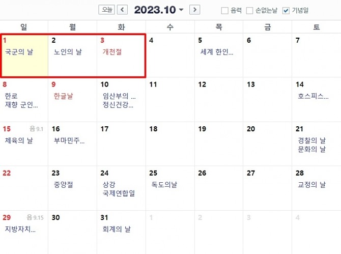 이미지 확대보기10월 2일 임시공휴일 지정이 확정되면 9월 28일부터 10월 1일까지 추석연휴 나흘에 임시공휴일 10월 2일, 개천절 10월 3일까지 총 6일간 연휴가 계속된다. 사진은 네이버 캘린더(달력)에 표시된 10월 추석연휴 마지막 사흘(빨간 네모 표시). 사진=네이버 캡처