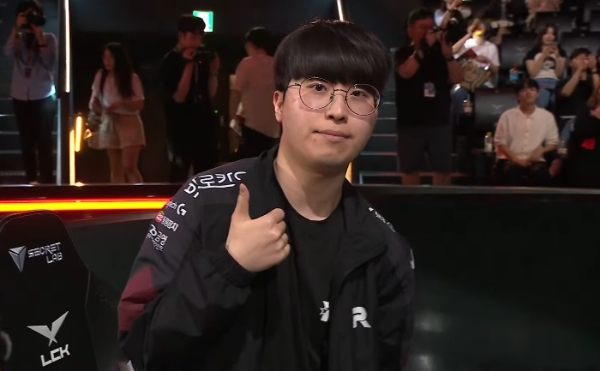 디플러스 기아의 원거리 딜러 '데프트' 김혁규 선수가 LOL 월드 챔피언십 대표 선발전에서 승리한 후 포즈를 취하고 있다. 사진=LCK 공식 유튜브 채널