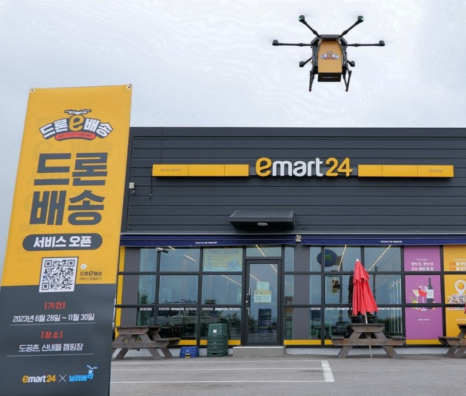 이미지 확대보기28일 이마트24에 따르 첫 번째 드론 배송 점포로 ‘이마트24 김천영남대로점’을선정하고, 인근 캠핑장과 전원주택 단지로 드론 배송을 진행한다.