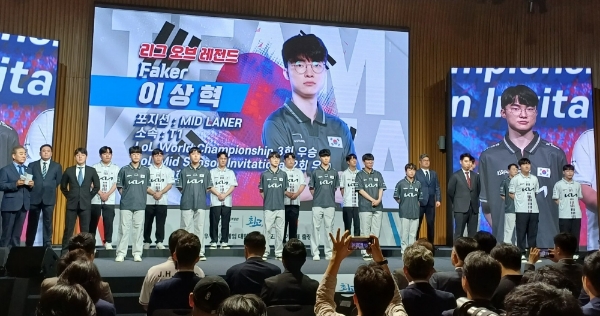 항저우 아시안게임 e스포츠 국가대표 출정식에서 감독·선수들이 모두 무대에 선 모습. 영상으로 리그 오브 레전드(LOL)의 '페이커' 이상혁 선수가 소개되고 있다. 사진=이원용 기자이미지 확대보기