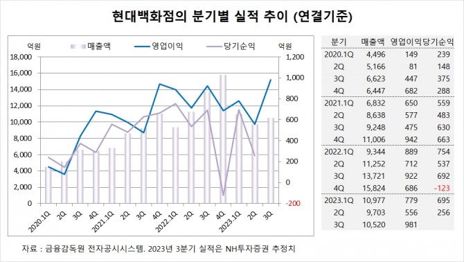 NH투자증권은 현대백화점의 3분기 연결기준 매출액이 1조520억원, 영업이익이 981억원에 이를 것으로 전망했다.