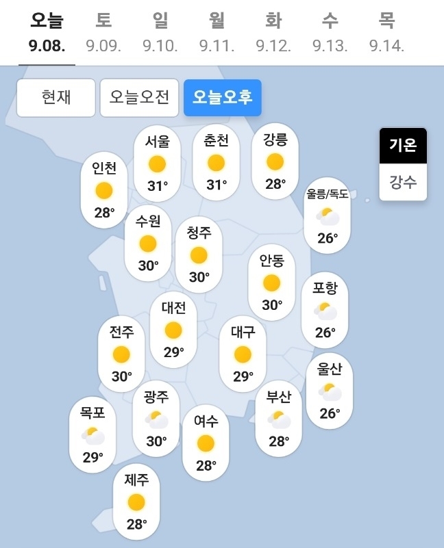오늘 아침 최저기온은 서울이 20도, 대전 18도, 광주 19도까지 내려가는 등 어제(7일)보다 조금 더 선선해질 것으로 기상청은 전망했다.