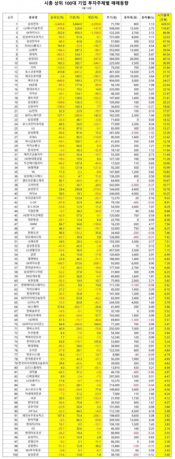 1위 삼성전자 5664억원(791만주), 2위 SK하이닉스 850억원(70만주), 3위 삼성SDI 669억원(12만주), 4위 현대차 534억원(28만주), 5위 LG에너지솔루션 529억원(10만주), 6위 NAVER 383억원(17만주), 7위 SK바이오팜 374억원(40만주), 8위 삼성전기 295억원(21만주), 9위 LG화학 287억원(5만주), 10위 기아 192억원(24만주), 11위 KB금융 178억원(32만주), 12위 KG모빌리티 147억원(153만주), 13위 카카오 134억원(28만주), 14위 셀트리온 128억원(9만주), 15위 삼성물산 126억원(12만주), 16위 우리금융지주 123억원(101만주), 17위 SK텔레콤 122억원(24만주), 18위 두산에너빌리티 108억원(64만주), 19위 CJ 106억원(12만주), 20위 하나금융지주 101억원(24만주)