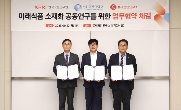 롯데중앙연구소가 한국식품연구원, 성신여자대학교와 '미래식품 소재화 공동연구를 위한 업무협약(MOU)'을 체결했다. 이번 협약으로 3개 기관은 식품·바이오 분야의 신소재 및 신기술 공동연구를 위한 산·학·연 전략적 협력체계를 구축한다. 푸드테크를 기반으로 한 대체육, 대체유, 식물성 단백질 등 각종 대체식품 소재 및 기술 연구를 통해 국내 소재 산업의 발전을 이루고 글로벌 경쟁력을 확보한다는 계획이다. 이를 위해 각 기관은 3자 간 파트너십을 구축하고 △미래식품 소재화를 위한 협동 연구 △식품·바이오 소재 산업 관련 연구 개발(R&D) 참여 △관련 산업 전문 인력 양성, 학생 교류 지원 △연구 기술 공유 및 시설 장비 교류 △산학연 공동연구의 협력체계 구축 등을 지원하기로 했다.