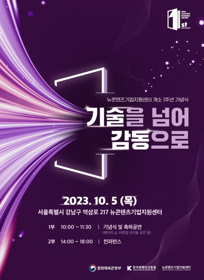 이번 개소 1주년 기념식에서는 ‘뉴콘텐츠 – 기술을 넘어 감동으로’를 주제로 ▲주요성과 발표(3개사) ▲오픈 컨퍼런스 ▲네트워킹 ▲축하공연 등 다양한 프로그램이 진행된다. 현장에는 입주기업 및 멤버십기업, 스타트업, 투자자 등 50여 명과 신기술 융합콘텐츠에 관심 있는 일반인 100여 명이 참석할 예정이다.