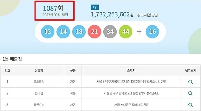 다음은 1087회 로또당첨번호를 맞힌 1등부터 5등까지 당첨자 수와 로또 당첨금(당첨금액), 구매 선택 방식, 로또 1등 당첨지역, 당첨판매점(배출점) 등 로또 명당이다.