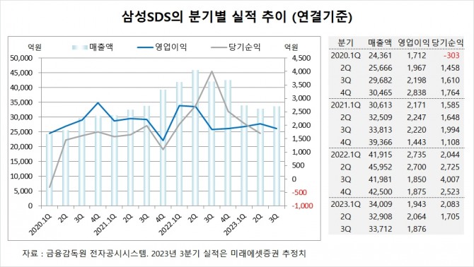 미래에셋증권은 삼성SDS의 3분기 연결기준 매출액이 3조3712억원, 영업이익이 1876억원에 이를 것으로 내다봤다. 3분기 영업이익은 시장 컨센서스인 2092억원을 하회할 전망이다.