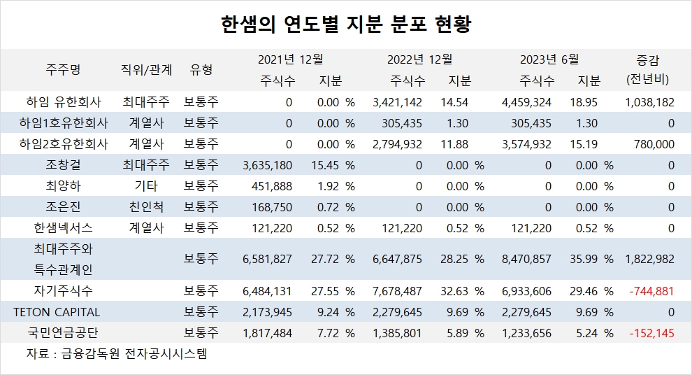 이미지 확대보기한샘의 최대주주는 하임 유한회사로 지분 18.95%를 보유하고 있다.